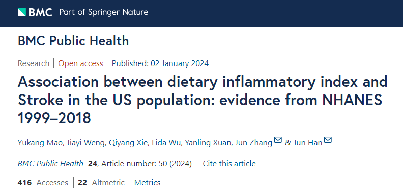 2024年1月,南京医科大学附属苏州医院、江南大学附属无锡市第五人民医院的研究人员在《英国医学会公共卫生》期刊上发表了一项研究显示,与饮食导致相关炎症会增加中风风险!与饮食炎症指数最低的人相比,饮食炎症指数最高的人,与中风风险增加87%相关。